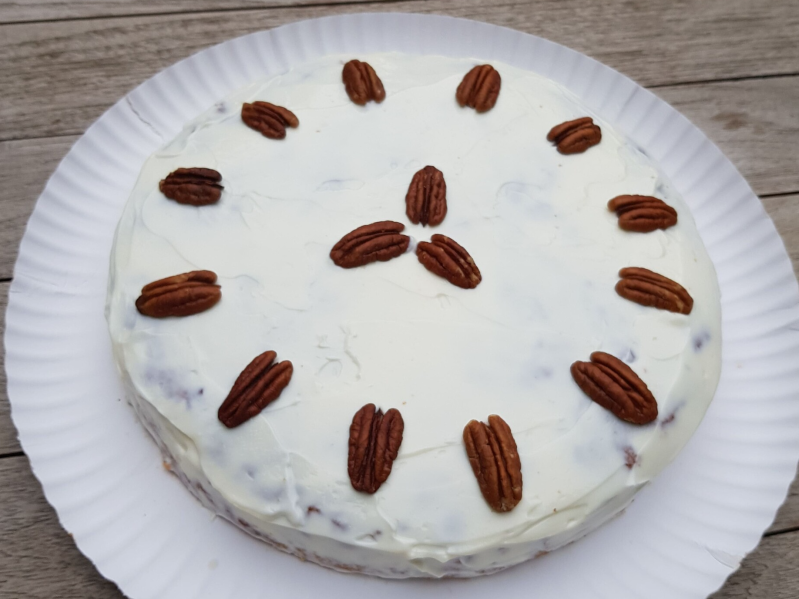 Lekker kruidige carrotcake met een roomkaas-topping. Naar keuze met walnoten of pecannoten.