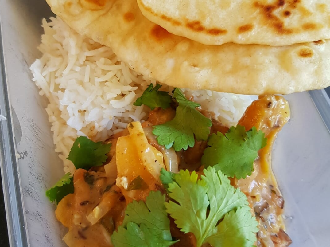 Kruidige masala curry met gebakken paneer (Indiaase kaas), abrikozen en cashewnoten. Een lekkere combinatie van een spicy masala met diverse kruiden en specerijen, tomaat en zoete abrikozen. Geserveerd met basmatirijst en een versgebakken naanbroodje.