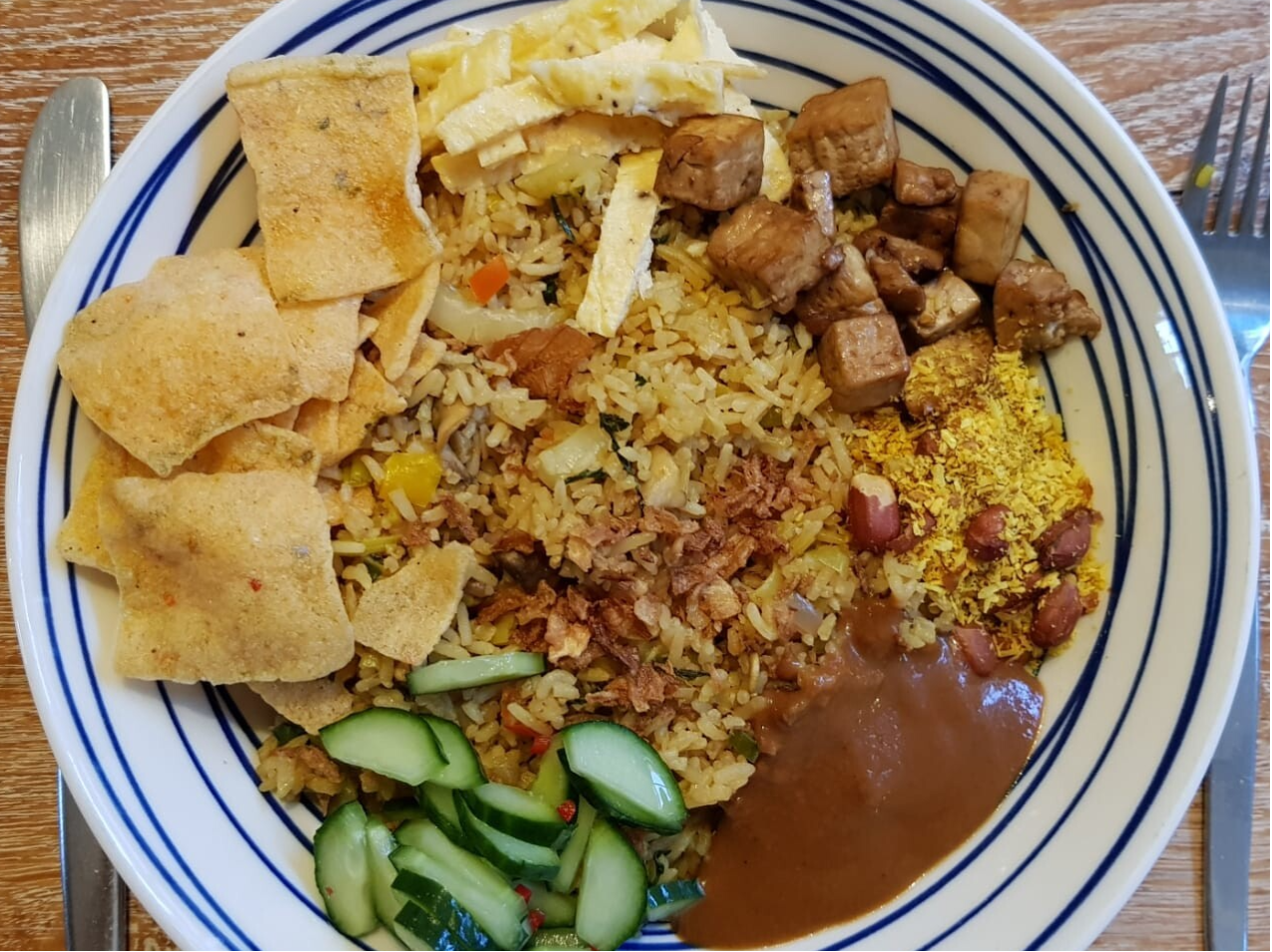 Lekker gekruide nasi met gebakken tofu, groenten, champignons en omeletreepjes. Met erbij huisgemaakte pindasaus, zoetzure komkommer, casave kroepoek, gebakken uitjes en seroendeng.